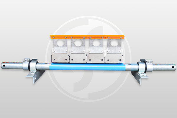 ♦ 刮刀座兩端各有一組定位支桿且配合設置有調整螺栓,可調整刮刀座之傾斜施壓角度,提供刮刀與皮帶間的受力大小。
