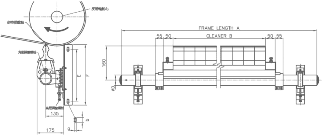 ♦ 刮刀座兩端設有可調整高、低位置的彈性支架,可提供刮刀與皮帶間的接觸壓力,可緩衝刮刀實施刮除作業時所產生之跳動,另設有壓力調整螺絲裝置。